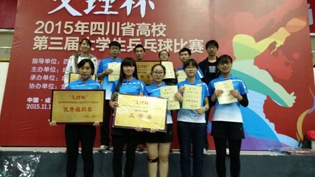2015年四川省第三届高校大学生乒乓球比赛于11月14日至15日在成都文理学院举行,来自四川大学、电子科技大学、西南交通大学、西华大学、四川师范大学、西南石油大学、西华师范大学等36所高校近400名运动员参加比赛。威尼斯官网乒乓球代表队10名运动员参加比赛,药学院陈栩夺得女子单打第5名,第二临床医学院余潇、体育学院宋城、莫桓、李宣运以及临床医学院叶广获得男子团体三等奖,来自管理学院的胥喜梅、第二临床医学院贺婉林、临床医学院梁雨晴、药学院陈栩、体育学院刘菊获得女子团体三等奖。体育学院教师陈远莉获