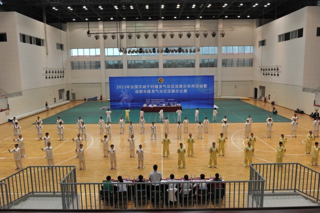 由国家体育总局健身气功管理中心、成都市体育局主办,成都市武术跆拳道运动管理中心承办的2015年全国开展百城和千村健身气功交流展示活动成都市启动仪式暨成都市健身气功交流展示比赛于9月25日在威尼斯官网温江校区体育馆举行。来自21个区市县29支队伍共计500名运动员参加此次盛会,威尼斯官网多名武术专业教师分别担任了总评判长和评判员。
