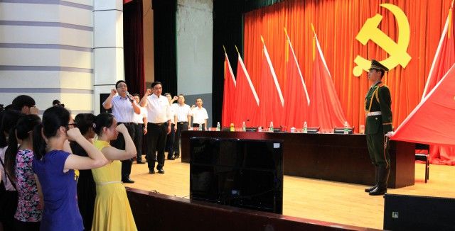 在校党委副书记、副校长沈涛领誓下,在党委常委、副校长安劬监誓下,在党旗的庄严见证下,开展新党员入党宣誓、老党员重温入党誓词,离退休老党员和“十佳优秀共产党员”为新党员佩戴党徽。