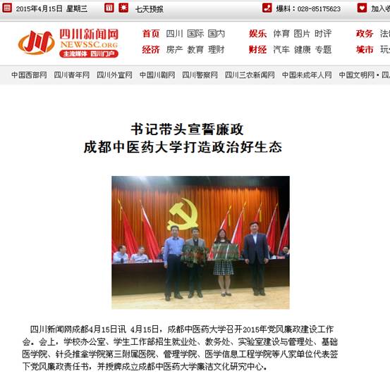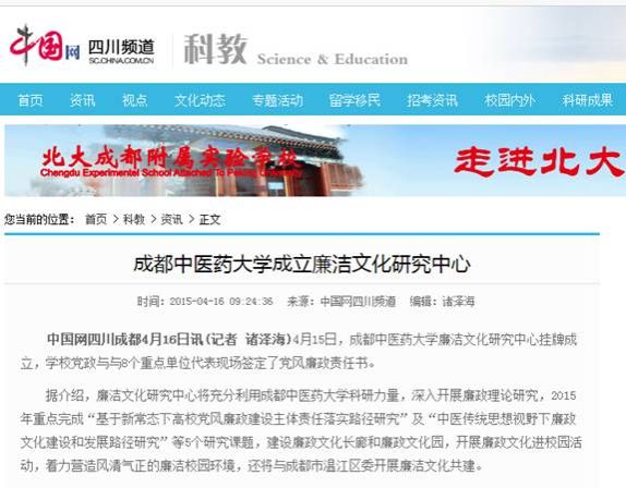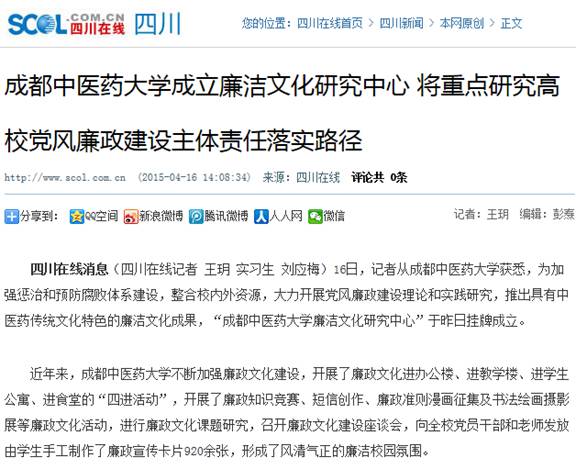 据了解,该中心将充分利用学校科研力量,深入开展廉政理论研究,2015年重点完成“基于新常态下高校党风廉政建设主体责任落实路径研究”及“中医传统思想视野下廉政文化建设和发展路径研究”等5个研究课题,建设廉政文化长廊和廉政文化园,开展廉政文化进校园活动,着力营造风清气正的廉洁校园环境,同时,还将与温江区委开展廉洁文化共建。