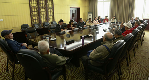 在外开会的校党委书记马跃荣得知老同志的到来,特地发来短信问候。沈涛代表学校党政感谢老同志为学校发展做出的贡献,感谢老同志对学校工作的关心和支持,欢迎大家来到新校区参观,祝老同志身体健康。沈涛简要汇报了新班子的工作情况,他指出,新班子工作顺利、稳定、向上,把富民升位作为工作目标,学校即将迎来60周年校庆,要专门召开老同志座谈会,听取大家意见。他还嘱咐离退休工作处要切实关心、照顾好老同志。