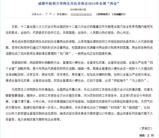 身处成中医校园的师生也时刻关注着两会的进程,从李克强总理的政府工作报告到政协委员和人大代表的提案,老师们和同学们通过不同的形式关注着两会,校园里到处充满着对两会探讨和思考的氛围,两会的各种热点话题也成了成中医师生课前课后要摆的“龙门阵”,一股两会风正在校园里吹拂。