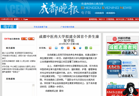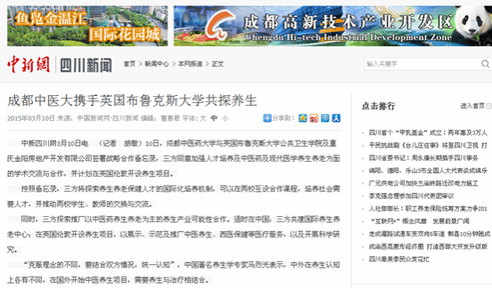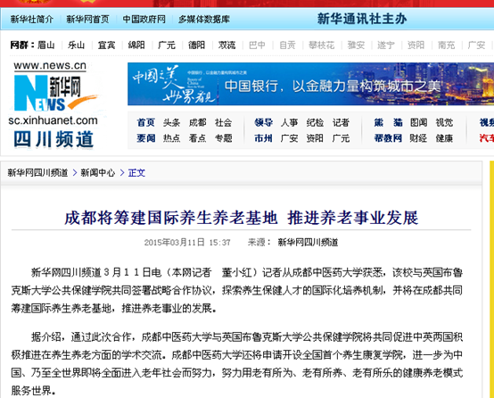 在备忘录签字仪式上,马跃荣介绍:“今后三方将围绕人才培养、共同研究,特别是将英国在养老方面取得的研究成果,在三方的共同支持下,于成都建立具有示范性的养生养老基地。并且通过中英两边积极推进在养生养老方面的学术交流,进一步为中国,乃至全世界即将全面进入老年社会而努力,做到老有所为、老有所养、老有所乐的健康养老模式服务世界。”