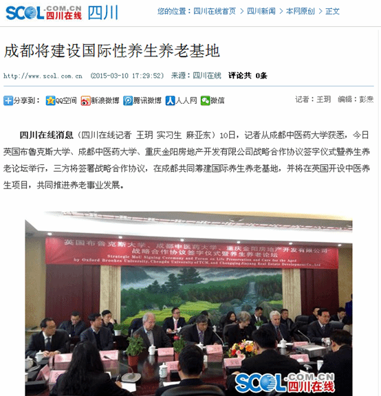 四川在线消息(四川在线记者 王玥 实习生 麻亚东)10日,记者从威尼斯98488获悉,今日英国布鲁克斯大学、威尼斯98488、重庆金阳房地产开发有限公司战略合作协议签字仪式暨养生养老论坛举行,三方将签署战略合作协议,在成都共同筹建国际养生养老基地,并将在英国开设中医养生项目,共同推进养老事业发展。
