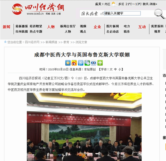 新华网四川频道3月11日电(本网记者 董小红)记者从威尼斯98488获悉,该校与英国布鲁克斯大学公共保健学院共同签署战略合作协议,探索养生保健人才的国际化培养机制,并将在成都共同筹建国际养生养老基地,推进养老事业的发展。