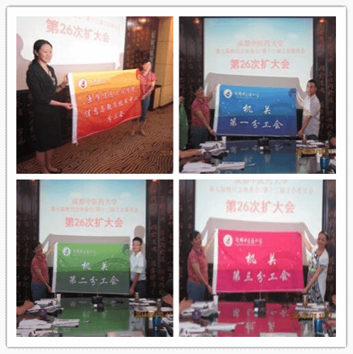 会议举行了新成立分工会的授旗仪式,傅春华为新成立的医学信息工程学院分工会,机关第一、二、三分工会授旗。