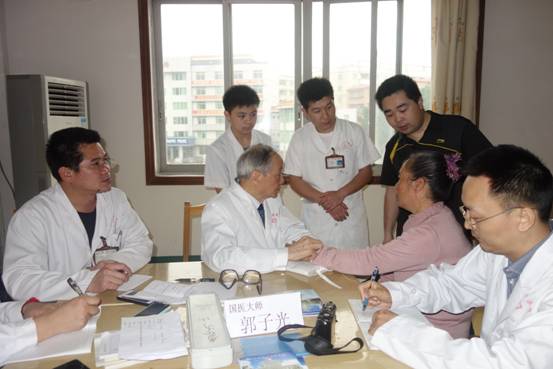 郭老此行的第一站是广东省中医院。医院拜师“国医大师”郭老的通知一经发出,就有近30名专家来报名。考虑到郭老年事已高,经过层层遴选,最终有9位中青年骨干专家得拜名师,他们是来自广东省中医院肿瘤、内分泌、血液、心血管、肾病、呼吸科等领域的杰出青年专家。广东省中医院为此举行了隆重的拜师仪式,广东省中医药管理局曹礼忠副局长亲临会场并与医院领导班子一道向郭老表达了由衷敬意和感激。广东省中医院终身名誉院长吕玉波深有感触地把开展传统中医“师带徒”教育称之为一个“抢救性”的历史重任,“‘国医大师’平均年近九旬,能像郭老这样亲自收徒的已经非常难能可贵。他们是中国传统医学特有的智能资源,身上有丰富的临证经验和学术思想,其鲜明的学科特点和学术地位无以替代。我们现在所做的工作,正是为了抢救‘国医大师’的医道瑰宝,弘扬中华传统文化和中医药国粹。” 弟子们向郭老鞠躬致礼、献花奉茶并纷纷表示,“这次得拜恩师,我们在欣喜与兴奋之余,也深感责任重大,日后必定在老师的指导下精研医术,传承其宝贵的学术思想,向恩师学习中医传承之道、为人为医之道、中华文化发展之道。”《中国中医药报》于次日图文并茂地报道了这一拜师盛况。