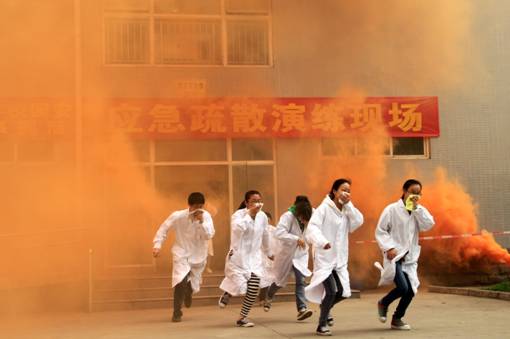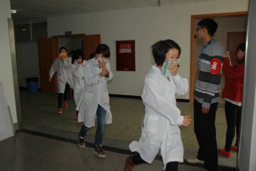 中午13时,在总指挥 “演练开始”的指令下,模拟“火灾烟雾”腾空而起,3号实验楼道内响起急促的警报声,预示发生紧急情况。此刻,正在实验室上课的230余名学生立即停止上课,在任课教师和现场安全引导员的指挥下,用毛巾、围巾等捂住口鼻快速有序地撤离到室外的空旷地带,以班级为单位集结并清点人数。整个应急疏散演练活动用时两分钟零十秒,演练现场无意外事故发生,达到预期的演练目的。