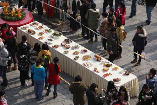 美食文化节上,校学生会生活部组织了多项参与性的互动游戏及厨艺比赛活动。各食堂推出了丰富的特色菜品及各地特色风味名小吃,并发放了优惠券和免费品尝券。