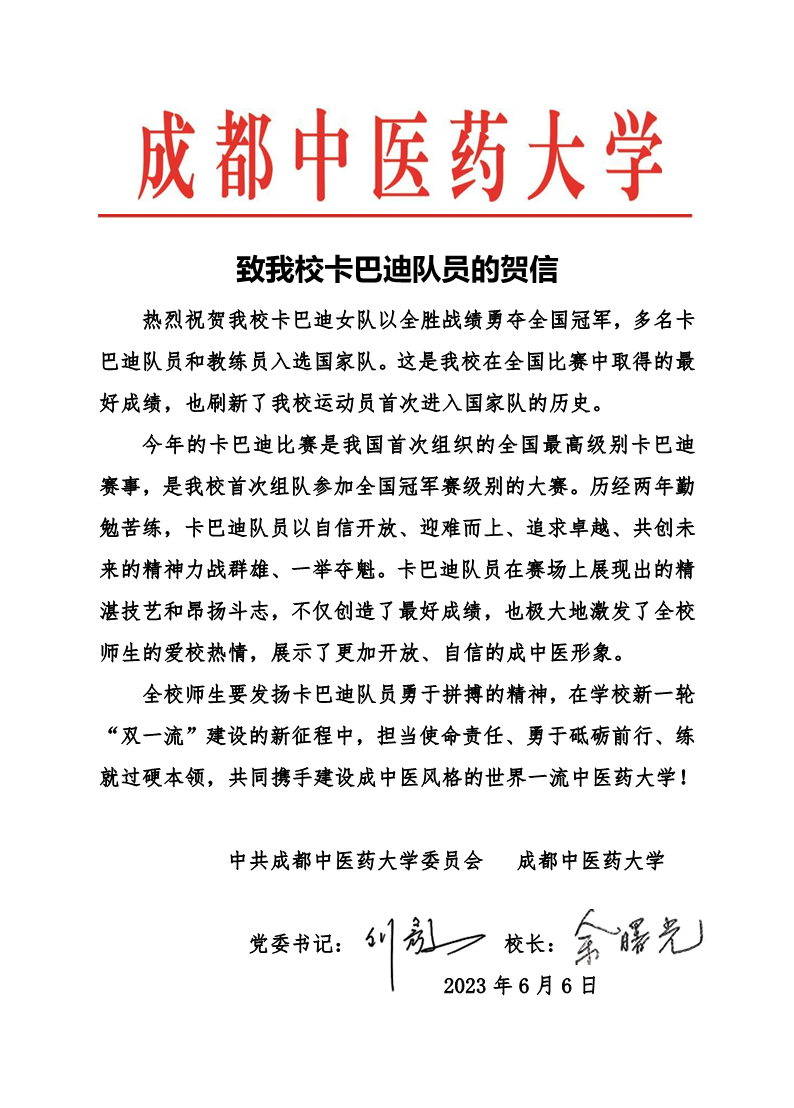 致威尼斯官网卡巴迪队员的贺信 发布时间:2023-06-06 16:15:12 浏览次数: 次 【字体:小 大】 【打印正文】 上一条:刘毅率团访问英国基尔大学及英国兰中医学院 下一条:【调研进行时】高质量学校实验平台建设及大型仪器平台共享调研:副校长黎胜红赴学院开展调研
