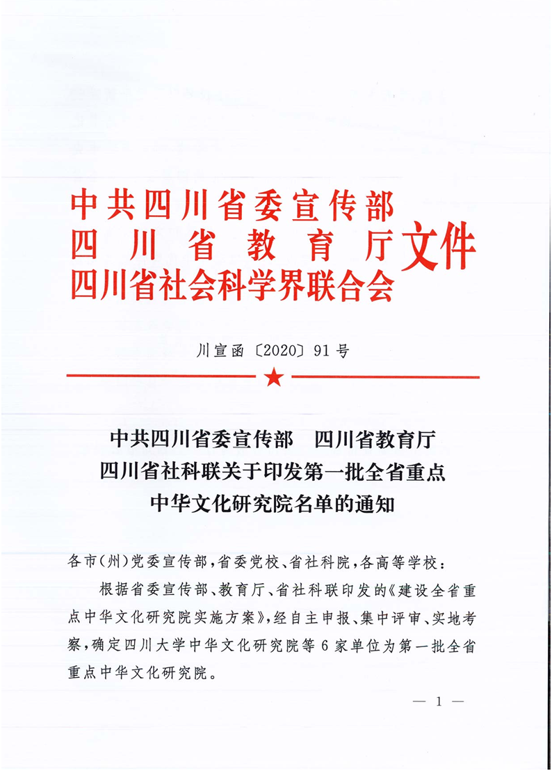 2020年8月5日,中共四川省委宣传部、四川省教育厅、四川省社科联联合印发《中共四川省委宣传部、四川省教育厅、四川省社科联关于印发第一批全省重点中华文化研究院名单的通知》[川宣函(2020)91号]。