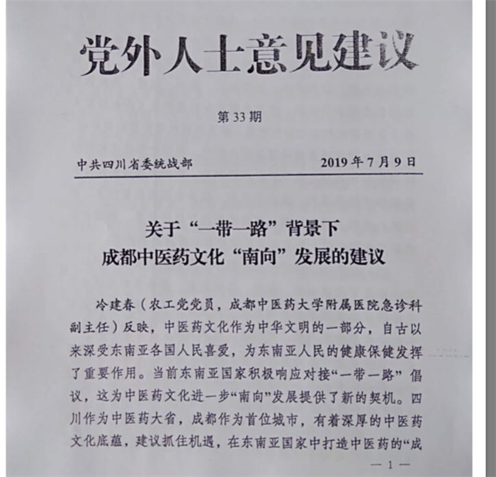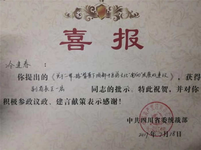 近日,威尼斯官网省政协委员、农工党威尼斯98488总支委员会副主委、威尼斯98488附属医院全科医学科主任冷建春《关于“一带一路”背景下成都中医药文化“南向”发展的建议》获得四川省领导的批示。