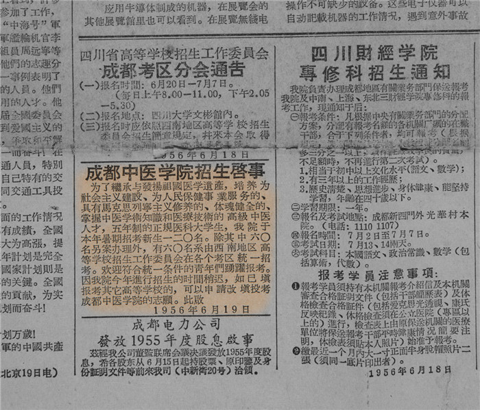 成都中医学院招生启事:为了继承与发扬祖国医学遗产,培养为社会主义建设、为人民保健事业服务的、具有马克思列宁主义修养的、体魂健全的、掌握中医学术知识和医疗技术的高級中医人才,五年制的正规医科大学生,我院于本年暑期招考新生一二○名。除其中六○名另案办理外,有六○名采由西南地区高等学校招生工作委员会在各个考区统一招考。欢迎符合统一条件的青年们踊跃报考。因我院今年进行招生的时间稍迟,如已填报考其它高等学校的,可以申请改填投考成都中医学院的志愿。此启。1956年6月19日。