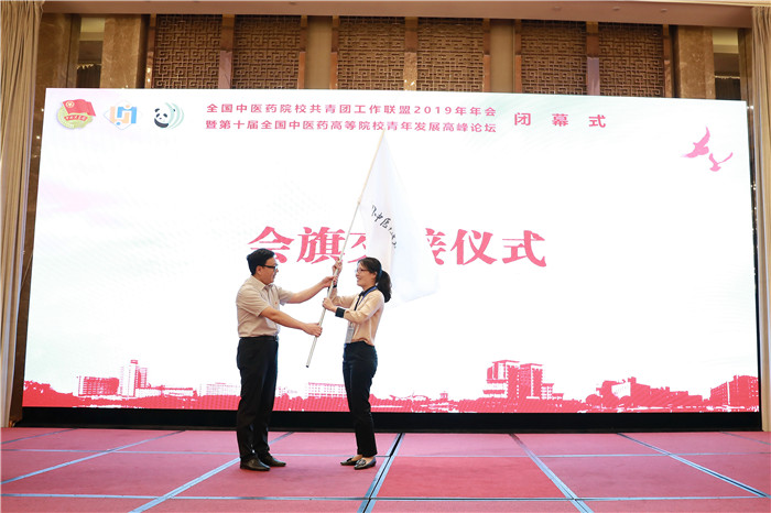 全国中医药院校共青团工作联盟2019年年会暨第十届全国中医药高等院校青年发展高峰论坛圆满完成各项议程后举行了闭幕式。会议对第七届“远志杯”全国高等中医药院校大学生课外学术科技获奖作品、年会“优秀论文”获奖作品进行了表彰。联盟理事长单位领导共同按下水晶球,启动将于今年7月在威尼斯98488举行的“青马工程·岐黄精英”首期培训班。温江区委常委、总工会主席刘宇彤为来自上海中医药大学的学生代表授予“感知温江行”旗帜,欢迎广大青年学子前来了解温江、体验温江、扎根温江。