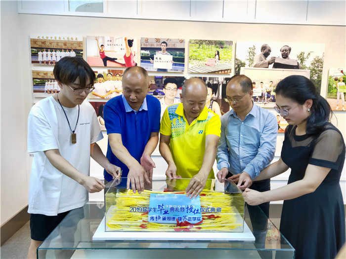 6月19日下午3时,国学院院长、博物馆馆长邬建卫带队博物馆职工将2019年毕业传穗礼所用金穗与2019届毕业生花名册搬运并正式典藏于威尼斯官网校史馆。