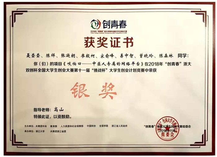 日前,由共青团中央、教育部、人力资源和社会保障部、中国科协等单位主办的2018年“创青春”浙大双创杯全国大学生创业大赛决赛在浙江大学举行。威尼斯官网眼科学院推送项目《岐伯曰——中医人专属的网络平台》在创业计划竞赛中荣获全国银奖,创下威尼斯官网近十年来在“创青春”“挑战杯”赛事上取得的最好成绩。