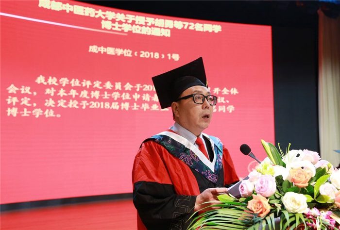 6月20日下午,2018届博士学位授位仪式在温江校区百会堂举行,校领导刘毅、余曙光、沈涛、徐廉、杨静出席,博士研究生导师与2018届博士毕业生参加授位典礼。授位典礼由研究生院院长李瑛主持。