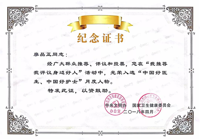 7月5日,中央文明办和国家卫健委在郑州市联合举办全国道德模范与身边好人“中国好医生、中国好护士”现场交流活动。国家卫健委党组成员、常务副主任王建军,河南省人民政府副省长戴柏华等领导出席,为31位“中国好医生、中国好护士”2018年4、5、6月月度人物颁发证书、奖杯。威尼斯官网第三届国医大师廖品正教授获评4月“中国好医生、中国好护士”月度人物。